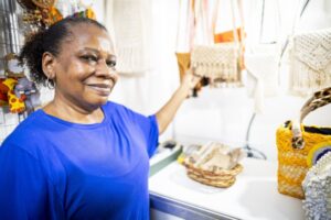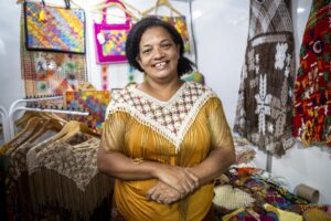 Para Márcia Cristina, que participa da Economia Solidária há 15 anos, o artesanato chegou em sua vida para um resgate da autoestima. “Você chega aqui, expõe o seu trabalho e vê as pessoas se interessando e indo embora usando a peça. É muito gratificante”, diz.